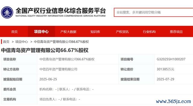 本年 6 月 25 日,宇宙产权交游中心初度透露中信青岛钞票料理有限公司 66.67% 股权挂牌转让信息,转让底价 30.14 亿元。
