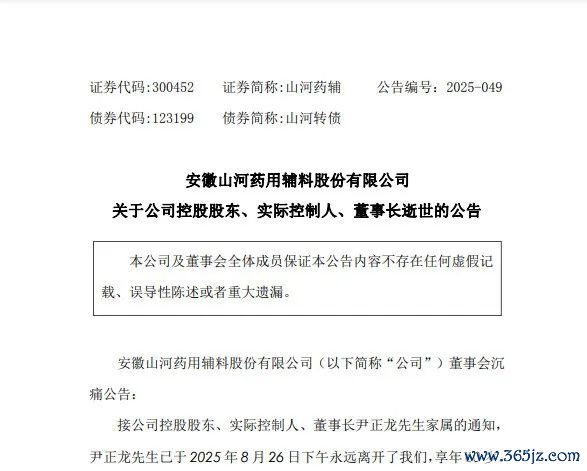 8月27日早间,江山药辅发布公告称,公司控股推动、实质已矣东说念主、董事长尹正龙于2025年8月26日下昼湮灭,享年60岁。